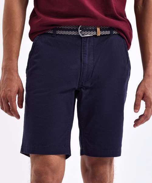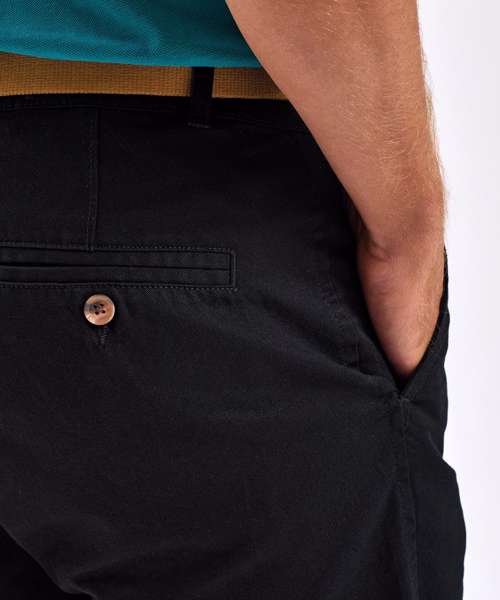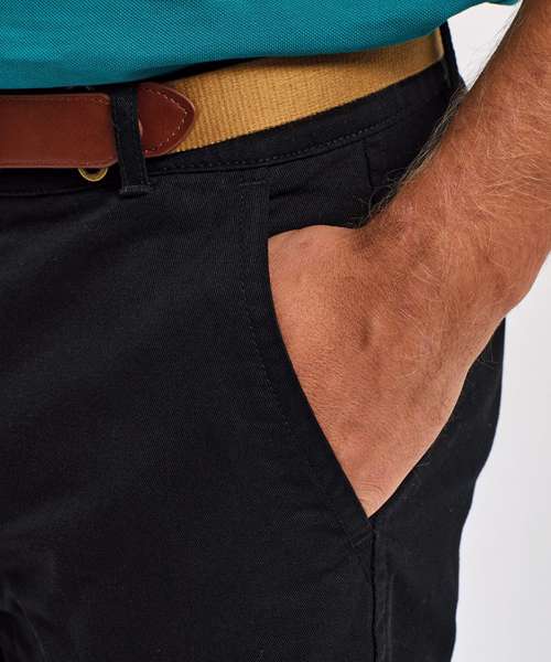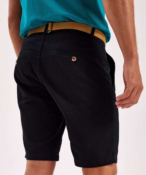 Men's chino shorts with two swings pockets and two back jet pockets with button fastening. Zip fly and button fastening to the front. Soft finish fabric. Product contains no branded neck label. Removable Kimble or looped garment tags. Inner seam label holds important product information on one label with a second label containing brand information which can be cut-away. Please note old stock may contain a fixed branded label.