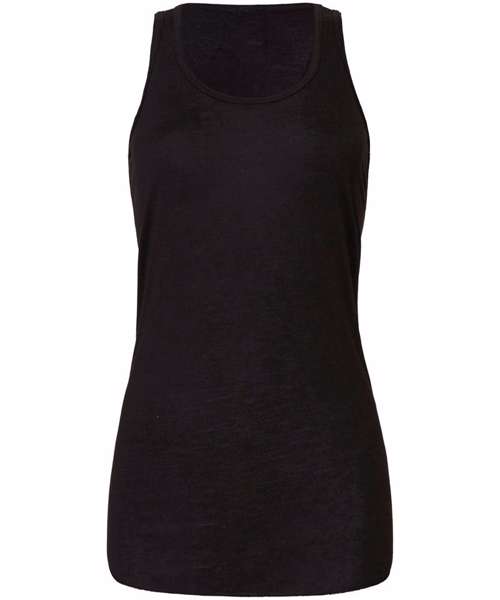 Merrowed bottom hem. Sheering at racerback seam. Racerback. Side-seamed. Easy, drapey fit.
