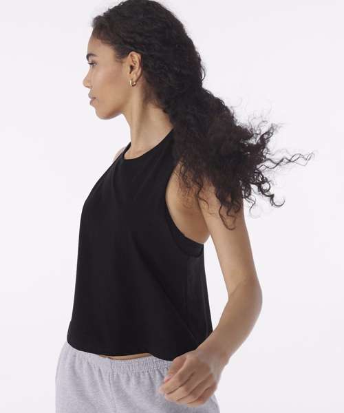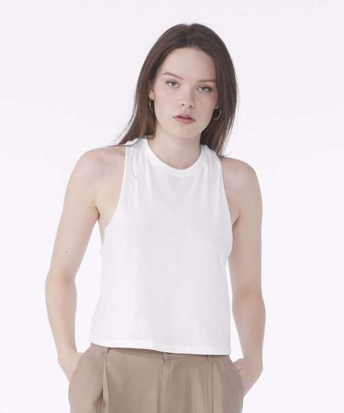 Side seamed. Relaxed, cropped fit. Racerback. Raw edge arm holes.