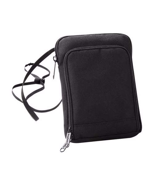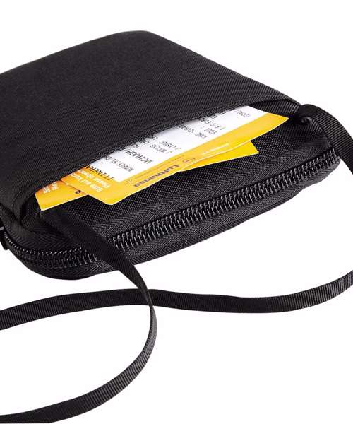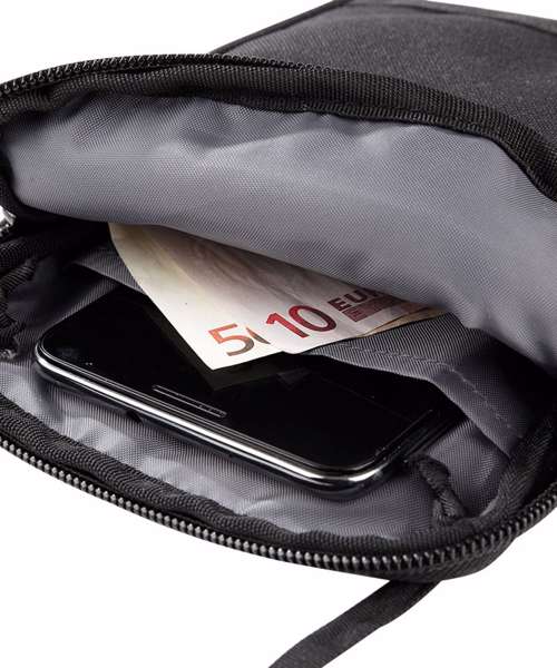 Hideaway adjustable neck cord. Smartphone compatible. Padded main compartment. Passport pocket. Organiser section.