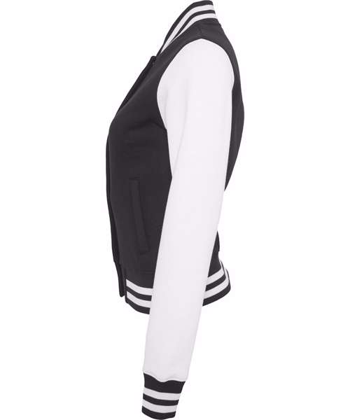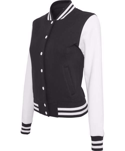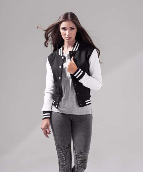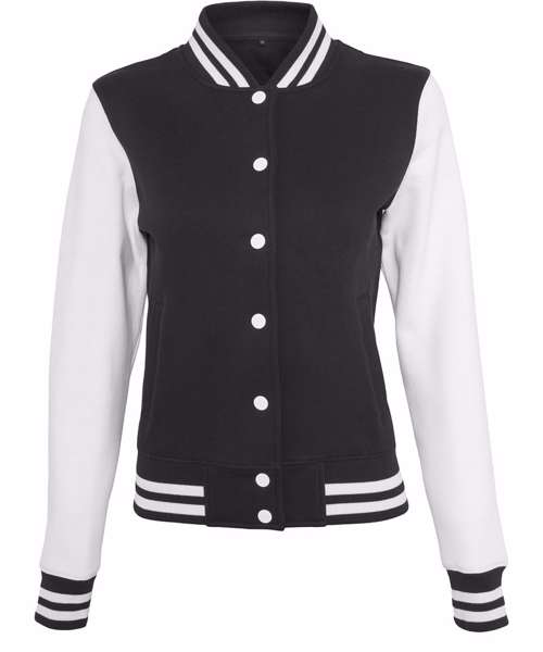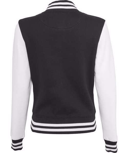 The college style presents itself as a cool stylish women's jacket with contrasted cuffs to offer a preppy look and feel. The inside brushed sweat fabric ensures a comfortable fit. Typical details include; striped rib cuffs at the collar, hem and sleeves and metal press-buttons to emphasise the cool look. Two pockets on the front, set-in sleeves and neck half-moon with neck tape. This item is manufactured in a FAMA Certified factory. FAMA stands for Facility and Merchandise Authorisation and is a high standard production certificate.