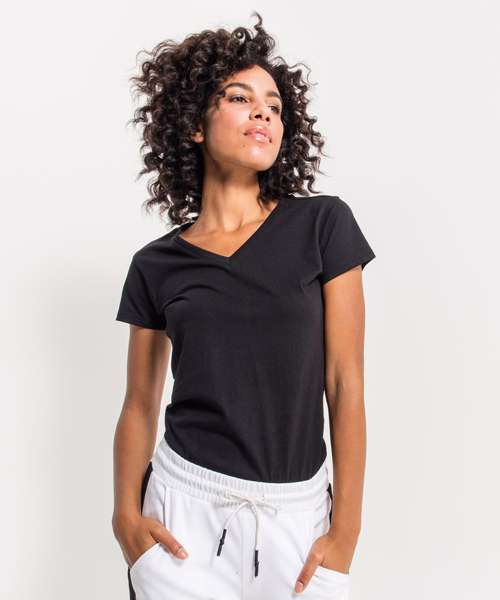 Everything an essential item needs: made of pure cotton, the Women's basic tee is comfortable and figure-hugging and goes with almost anything. The little v-neck makes a lovely feminine detail. The cotton fabric is ideal for screen printing as well as flex and flock print work.