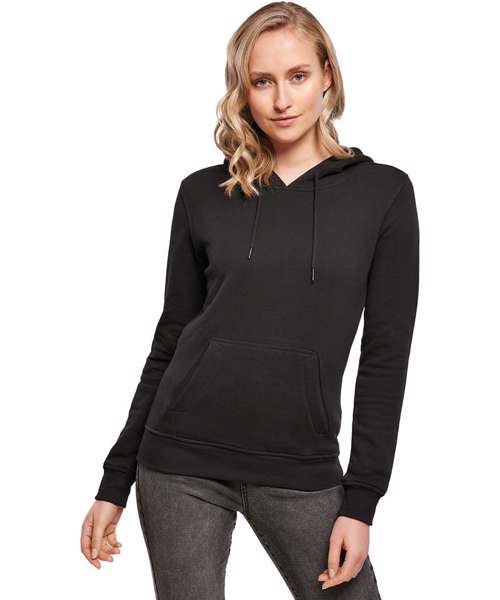 This sporty hoodie pleases with reliable features, as well as with a successful, feminine reinterpretation of its classic origins. Wide cuffs, kangaroo pocket and a cosy hood with tonal drawstring provide a real snug feeling, especially since the hoodie is softly lined with half-brushed fleece. Skin-friendly and ecologically sustainable, it’s made from 100% organic cotton. The slightly tapered cut brings out the feminine side of a casual streetwear piece that may also be personalised by flock printing, screenprinting or embroidery.