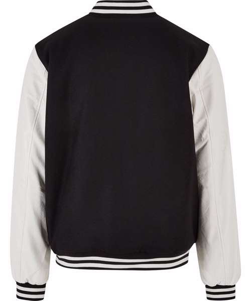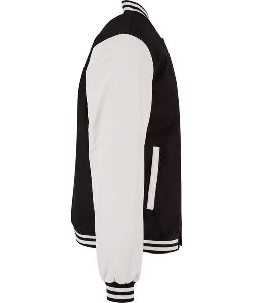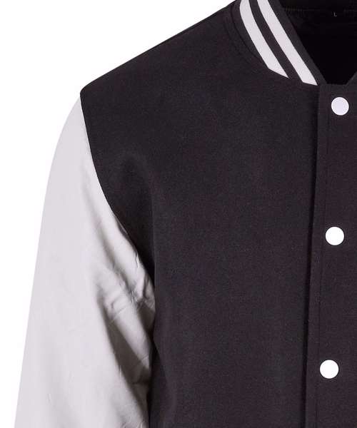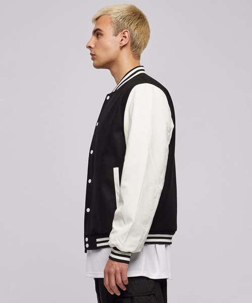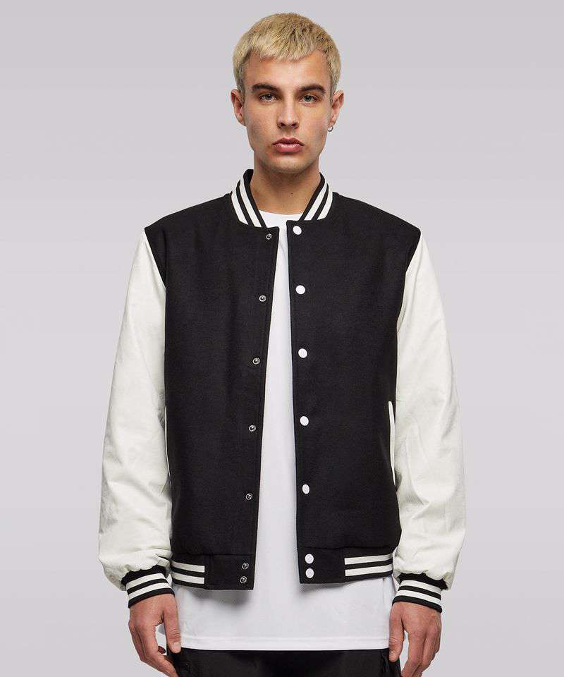 Equipped with contrasting sleeves, this men’s college jacket exudes retro vibes. Classic details such as a snap button placket, striped stand-up collar, hem and cuffs complete the look. Its design is rounded off by colour-accentuated side pockets and rib cuffs. The fabric consist of wool and viscose to ensure comfort in this regular cut. The jacket can further be refined via embroidery.