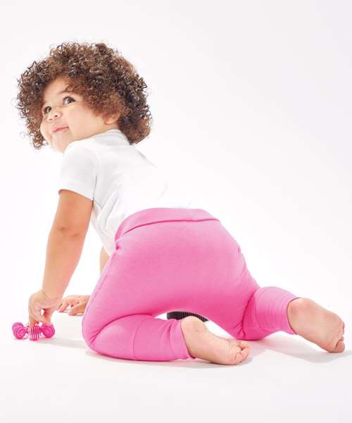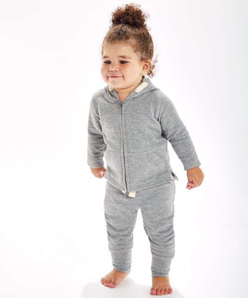 Loose fit baby sweatpants with brushed inner and dropped crotch styling for a modern look. Seam free at front and back body for increased decoration potential. Oeko-Tex certified.