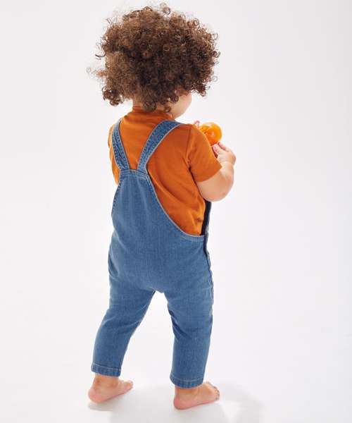 All-in-one dungarees in soft but durable organic denim. Featuring adjustable front poppers at bib and side waist, and straight hems which can be rolled up to suit. Jeans-style, orange stitching is featured throughout the garment. Designed for easiest and optimum decoration potential with no centre front or back seam, but with Tear-out label.