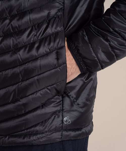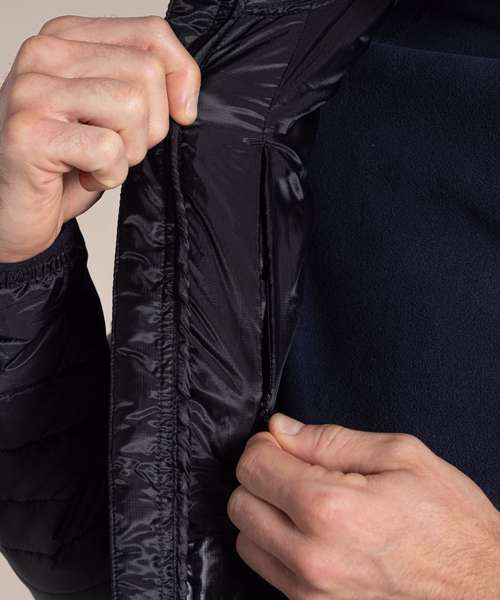 Water-resistant padded jacket with a full-length zip and 4 pockets, one of which doubles as a stow pocket. Recycled polyester mini ripstop with EcoShield DWR finish outer and lining. ThermoPro recycled polyester fill and recycled zip tapes. 4 pockets: 2 welted zipped lower, 1 concealed zipped inner and1 passport RFID.