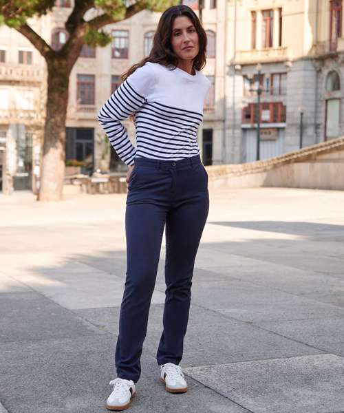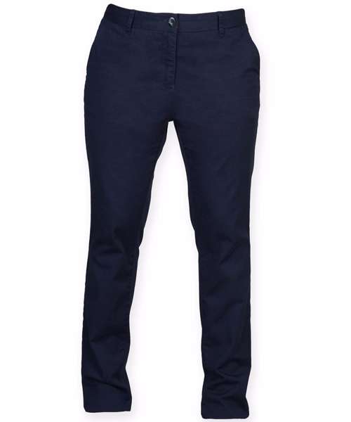 Flat front chino trouser. Tag free. Stretch fabric for ease of movement. Slanted front pockets, 2 back welt pockets, belt loops plain hem.