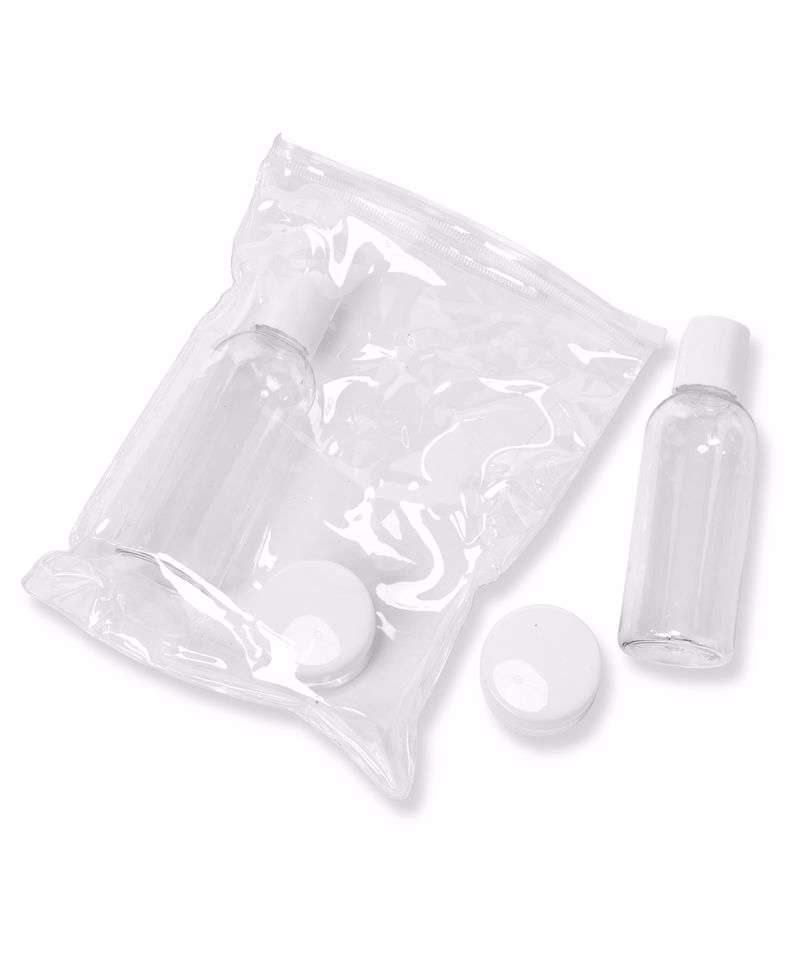 Travel bottle set with transparent PVC pouch. Includes 4 travel-sized reusable plastic bottles. Bottle size within accepted airline travelling limitations.