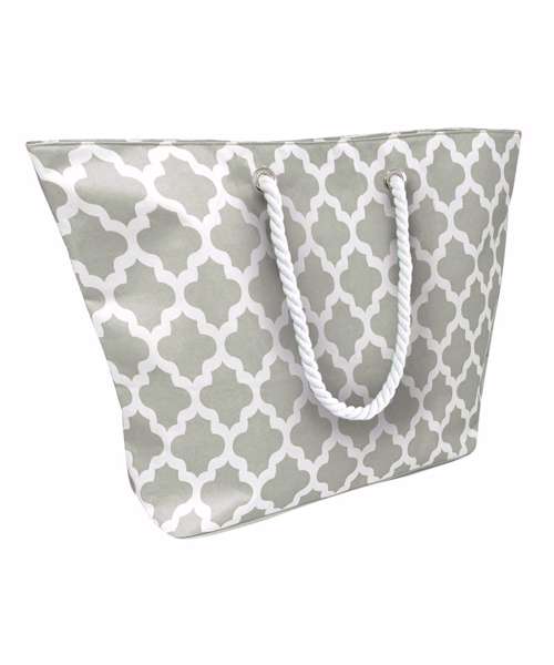 Moroccan-design beach cool bag. Insulated foil inner. Tough exterior fabric. Rope carrying handle with zip fastening.