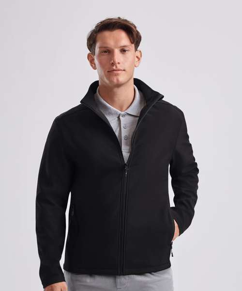 Classic fit. Bonded two-layer softshell material with water-repellent BIONIC-FINISH® ECO treatment (fluorine and PFC-free). Outer face material and inner fleece lining made from recycled polyester. Cadet collar. Storm flap. Side pockets.