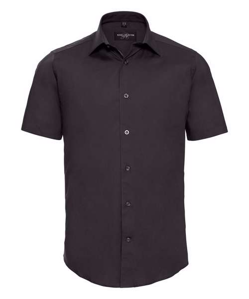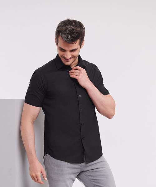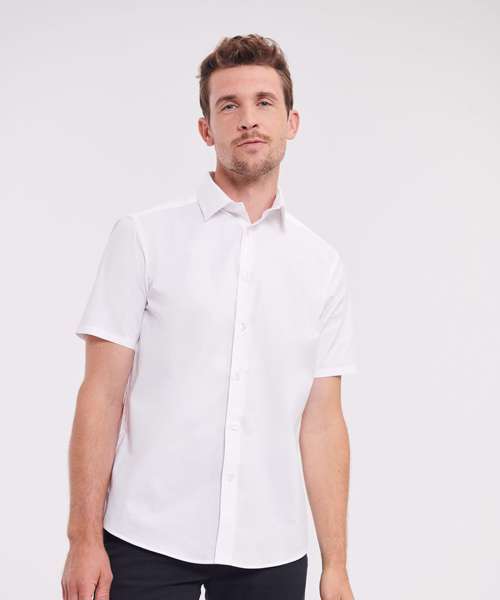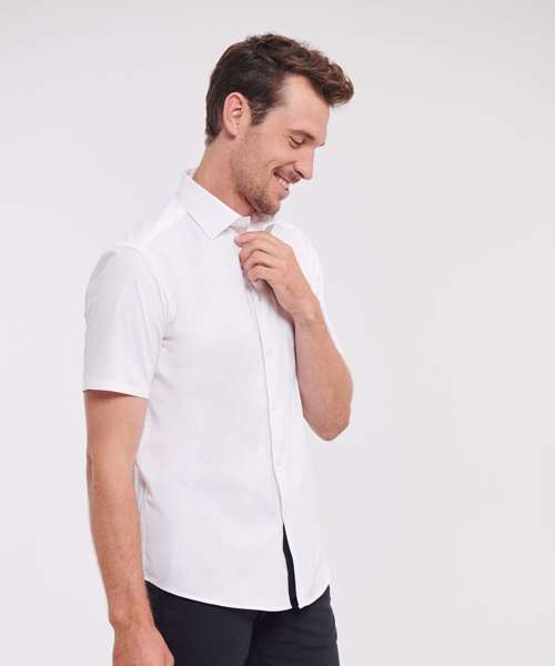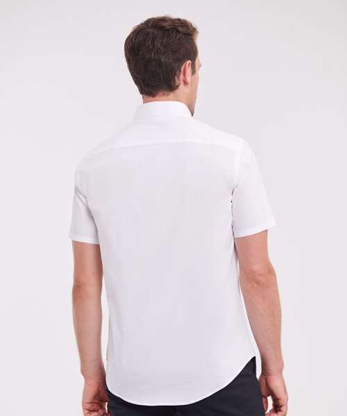 Fitted cut and contemporary design make this style the right choice wherever a modern appearance is required. Smooth fabric with a slight stretch for added comfort and fit. Smart, semi cut-away collar with single button. Rounded hem.