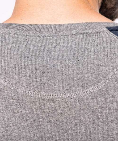 80% cotton / 20% polyester. Made from 80% organic cotton. French terry fleece. LST (Low Shrinkage Terry). Ribbed neck, cuffs and hem. Herringbone twill taped neck. Stitched V detail at front neck. No brand label at neck, only size tag for easy relabelling. Certifié STANDARD 100 by OEKO-TEX®N° CQ1007/7, IFTH.