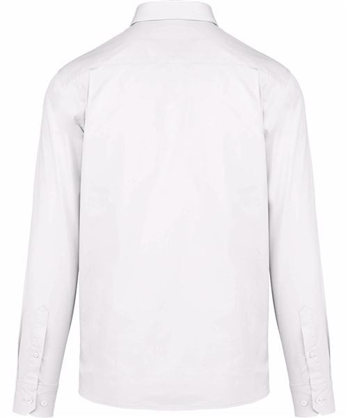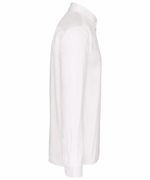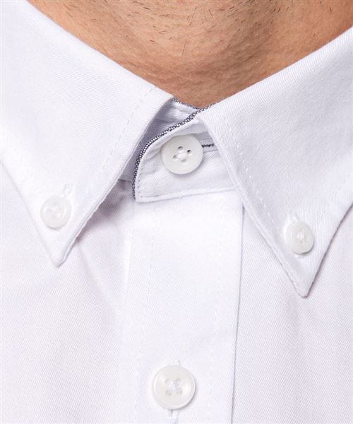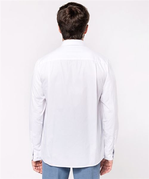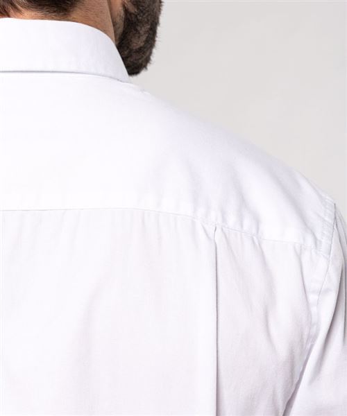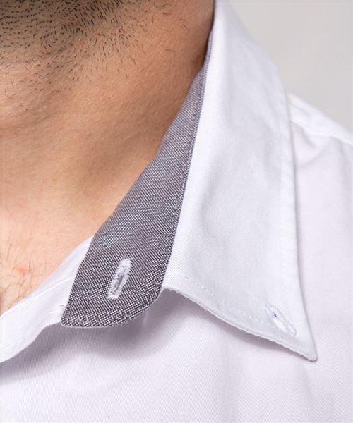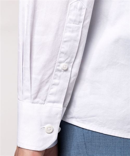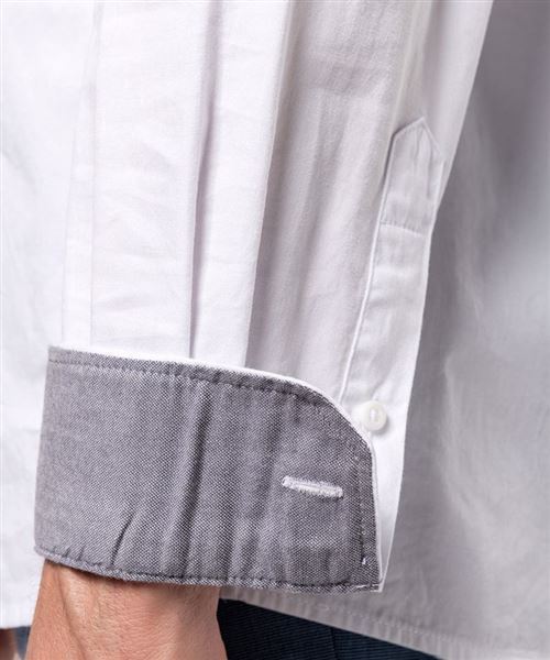 100% cotton. Twill fabric with peached soft touch. Button-down collar. Matching buttons. Chest pocket on left side. Contrast Oxford silver inner collar stand and cuffs. Back with 2 side pleats and lined yoke. Felled seam finish. Adjustable cuff with button pointed tab end. Spare button. Certifié STANDARD 100 by OEKO-TEX®N° CQ1007/8, IFTH.