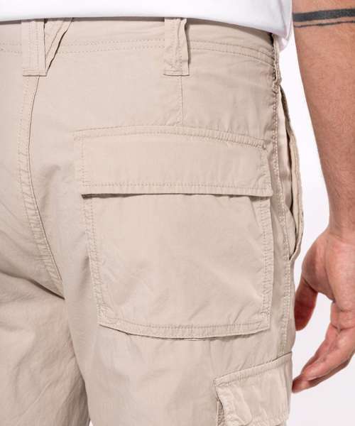 100% cotton poplin. Washed fabric for a soft and comfortable feel. Drawstrings inside the waist. Zip fastening and press stud. 2 Italian side pockets and 1 coin pocket. 2 gusseted patch pockets with flap and press stud at back and sides. Knee yokes.