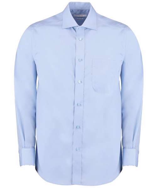 Fused stand-up semi cutaway collar. Non iron. Wrinkle-free taped seams. Double-stitched side and sleeve seams. Single needle stitched armholes. Rounded hem. Two button cuff. Two pleats at back. Chest pocket to the left side as worn. Spare button. Kustom Kit® woven back neck label.