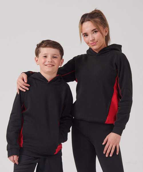 Contrast side panelling and contrast piping on raglan sleeve with contrast-lined drawstring hood and angled pouch pockets.