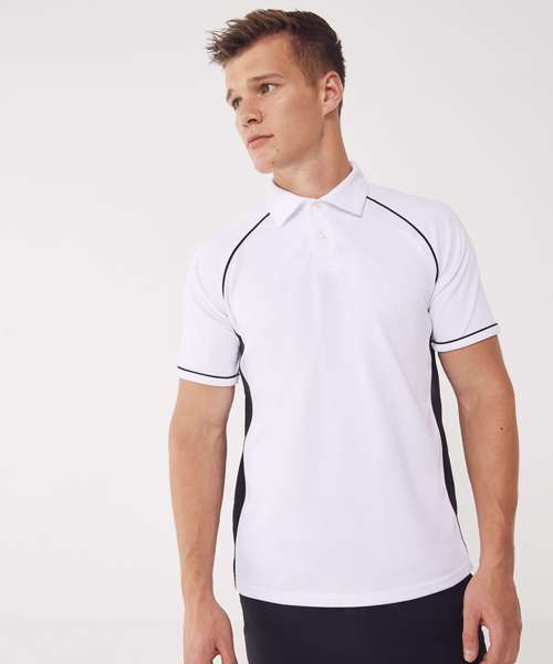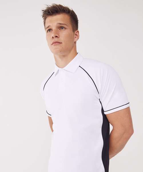 Made using Coolplus® specially modified polyester fibres enable rapid absorption of perspiration from skin surface. Piping along raglan seams and down front and back. 2 button placket self fabric collar.