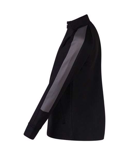 Knitted tracksuit top with contrast colour panels on outer sleeve. Contrast colour centre front zip. Zipped side pockets. Funnel neck and 1x1 ribbed cuffs. Semi-automatic lock zip sliders on all zips.