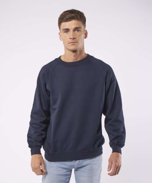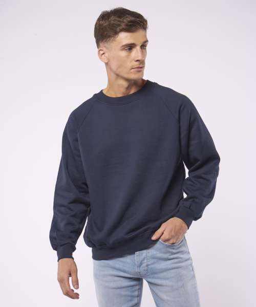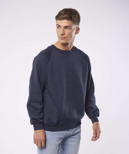 Easycare, crew neck, raglan sleeve sweatshirt with cover seam finish around neck, welt and raglan. Herringbone taped neck. Also available in kids.
