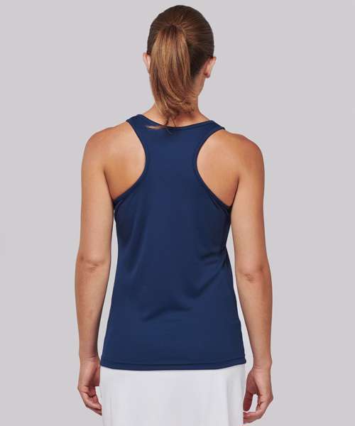 100% Polyester. Quick drying Lightweight fabric. Racer back style. Bound neck and armholes. Twin needle finishing. BSCI certified. Oeko-Tex certified.