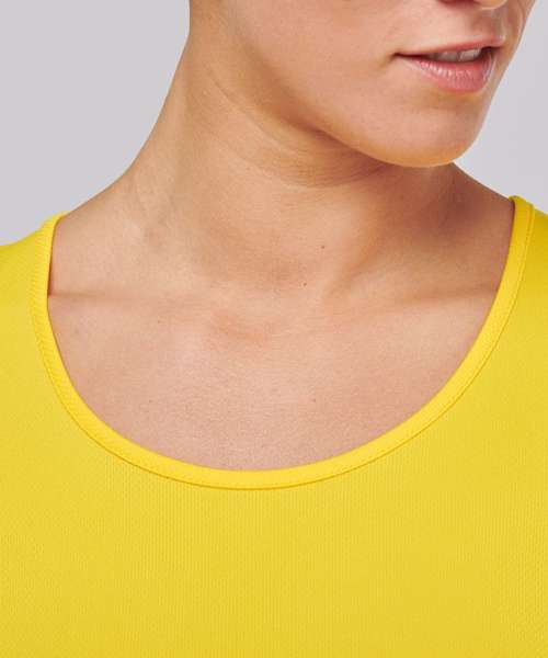 100% polyester. Quick-drying lightweight fabric. Racer back style. Bound neck and armholes. Twin needle finishing at the hem. Certified STANDARD 100 by OEKO-TEX® N° CQ 1007/7, IFTH.