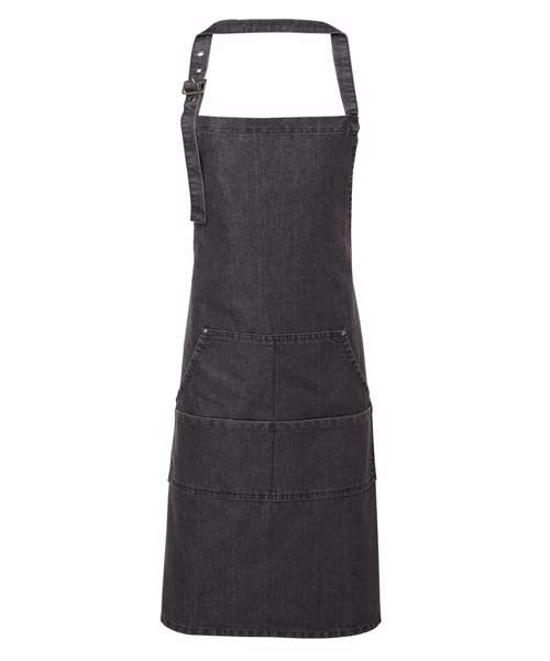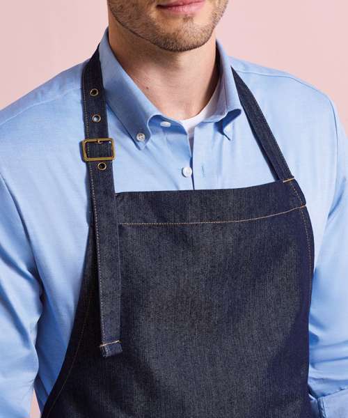 This denim bib apron is a modern solution for bars and restaurants who are looking for something a little bit different from their staff uniform. This full bib style offers hygienic coverage against spillages and can be industrially laundered to 85C. A buckle on the neckband allows the wearer to adjust the length of the apron and there are four contrast stitched pockets to the front that are perfect for carrying payment terminals and order pads. Self-fabric ties can be fastened neatly at the back, or alternatively, are long enough to double around the waist and tied at the front.