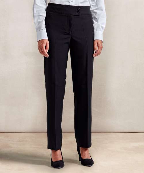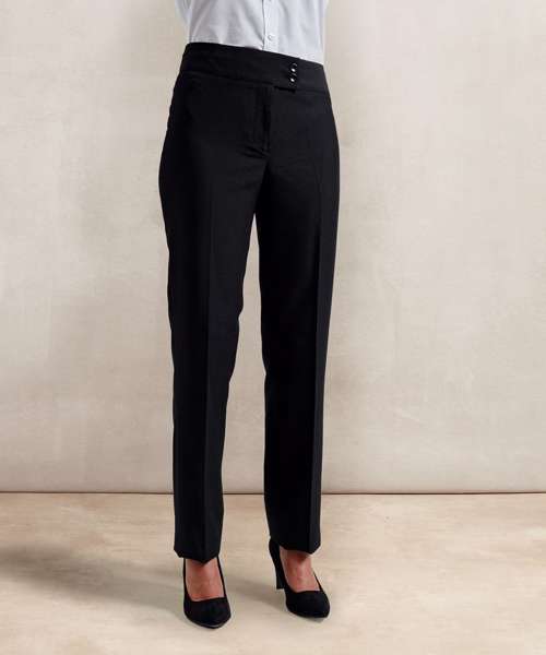 A straight leg trouser for women that features a deep waistband with cross-over tab and with two button fastening. Available in two leg lengths and four colours, this is great all round uniform trouser for women.