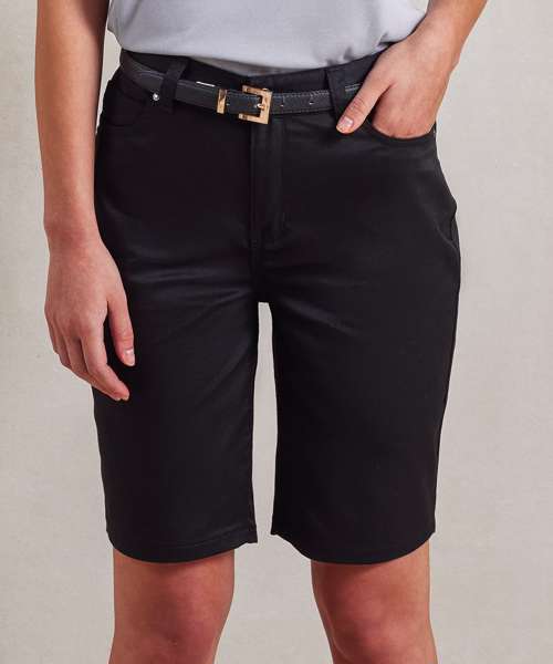 Based on the popular chino jeans, these women’s chino shorts are styled with a covered zip fly fastening and button to the waistband. There are loops on the waistband to facilitate a belt, two side pockets with rivet detail and two patch pockets to the reverse. Finished with a double turned hem, they are a great option for the warmer months and offer a more casual and playful approach to corporate dressing. A touch of elastane through the fabric provides an element of stretch for maximum comfort.