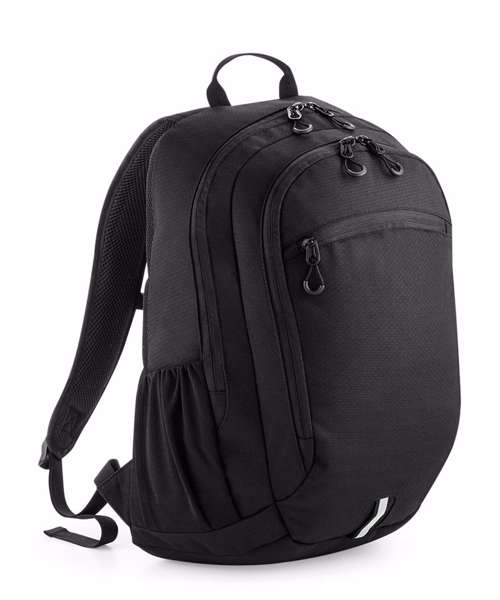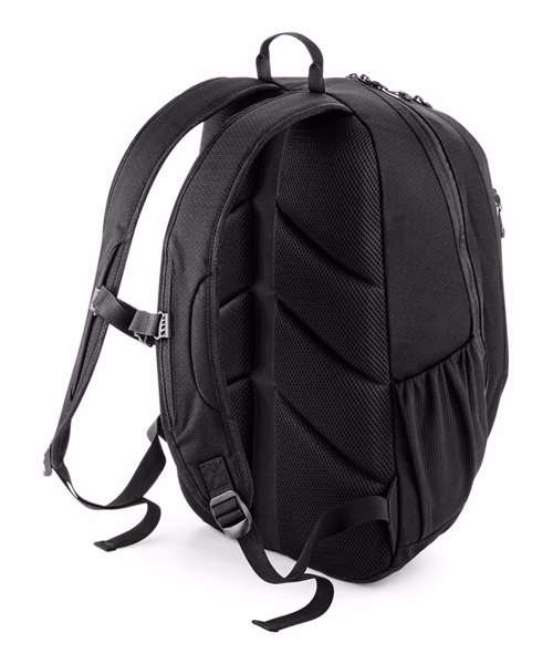 TearAway label for ease of rebranding. Laptop compatible up to 15.6". Dual compartment design. Padded laptop compartment. Reflective accents. Two mesh pockets/ water bottle holders. Zippered front pocket. Internal mesh pocket. Ergonomic padded back panel. Padded adjustable mesh shoulder straps. Adjustable chest straps. Grab handle. Reach certified.