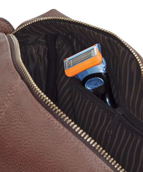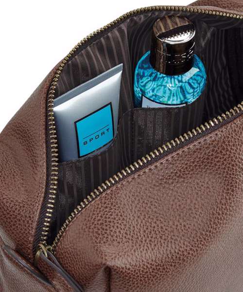 TearAway label for ease of rebranding. Wipe clean interior. Fully lined in pinstriped fabric. Vintage style metal fittings. Internal pockets.