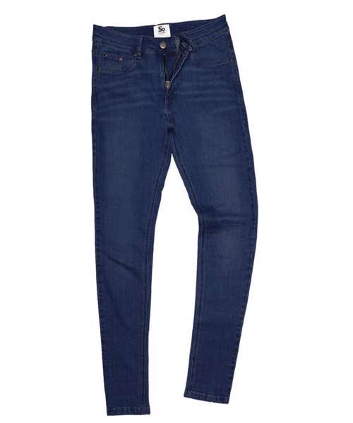 Skinny fit, mid rise, stretch denim, 5 pocket styling, light blasting and whiskering, self-fabric belt loops, shank button and YKK zip fly fastening, metal rivet detail at pocket corners, twin needle stitching detail.