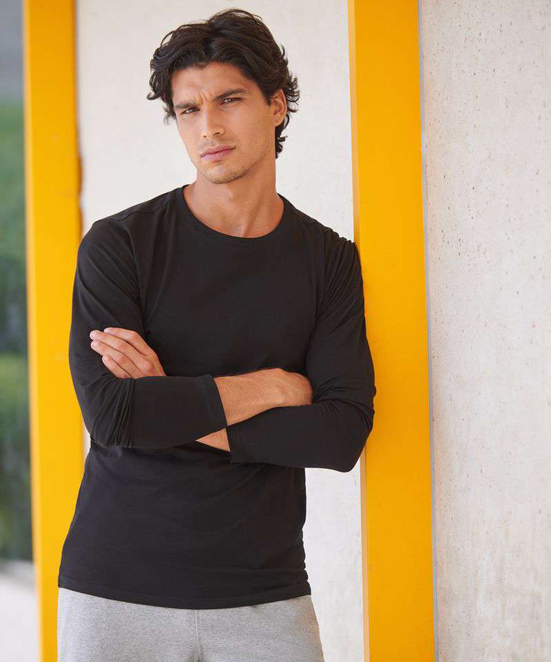 Break up the routine with this stylish stretch long sleeve in essential modern colours. Ribbed crew neck with back neck tape ensures a premium finish. It has a unique soft-hand feel with a modern longline fit. Soft stretch fabric. Supreme finish. Feels good. Features tear-out label for easy rebranding.