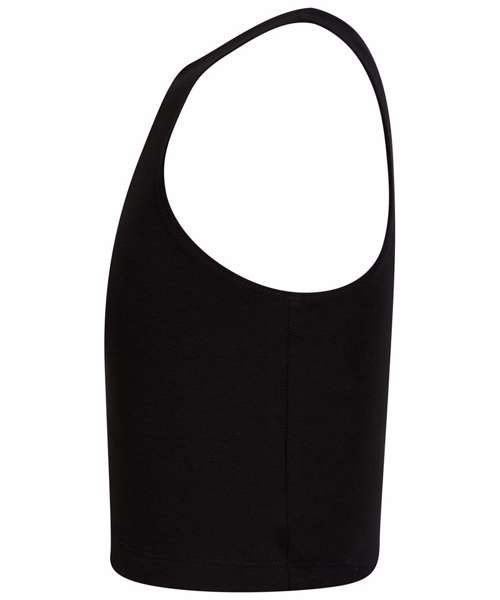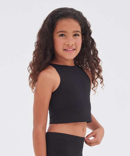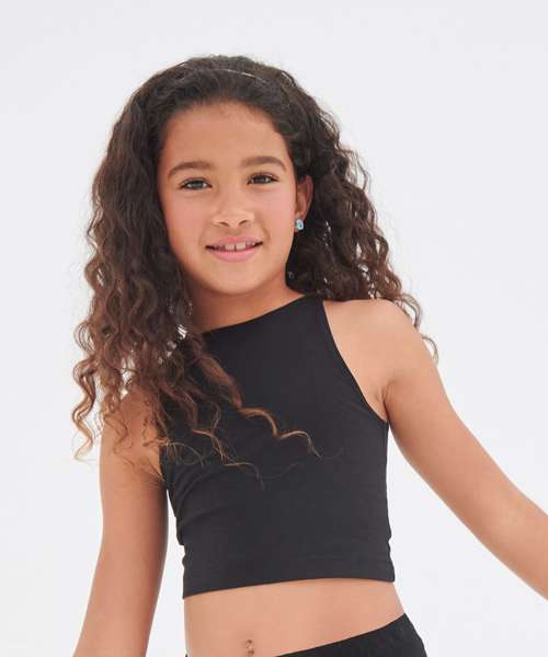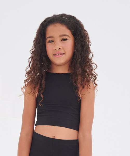 Kids cropped top with racer shape on front and back on neckline. Twin-needle stitching on hem, armholes and neckline. Cropped length. Tear-out label.