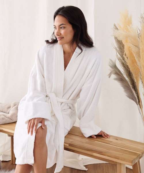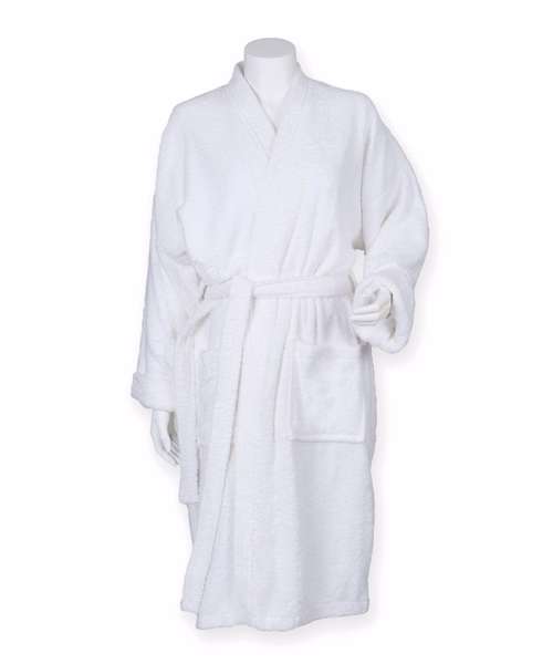 The kimono robe features modern styling, made from 100% cotton terry with deep patch pockets and matching tie. The product is a great cover up at the spa to sit back and relax after treatments.