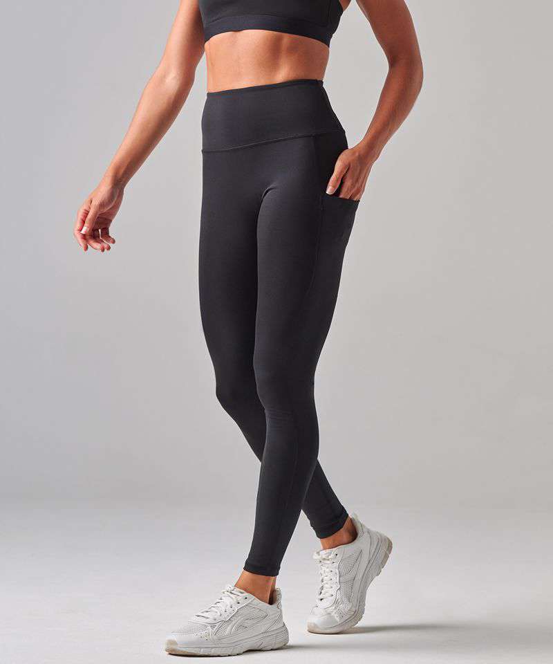 Women's core leggings with high waist and deep waistband. Phone pocket in side panel on left side. Tear-out label.
