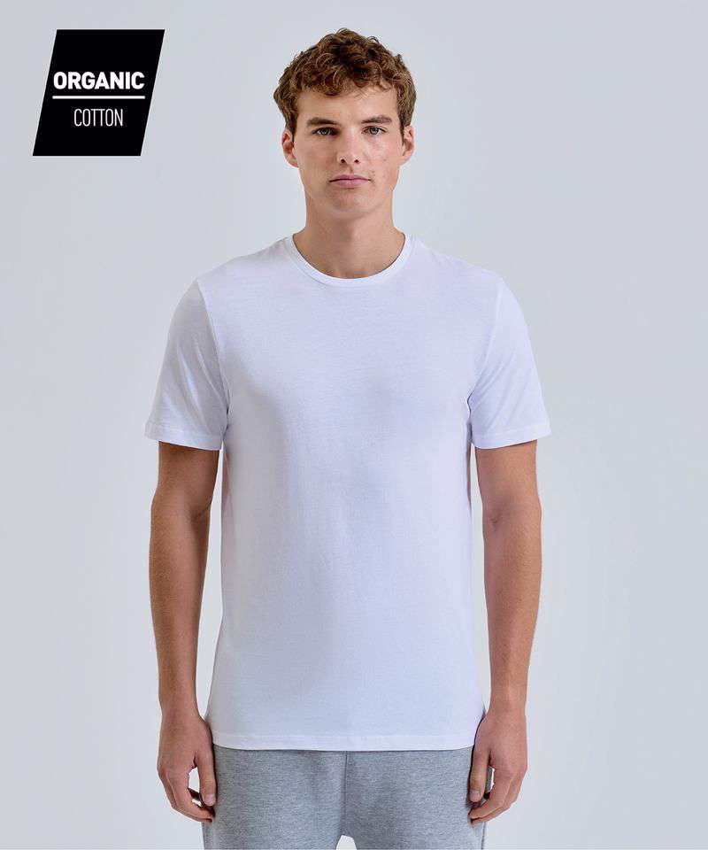 Organic cotton fabric. Crew neck. Short sleeve. Lightweight. Twin-needle stitching on hem and arms. The product contains no branded neck or waist label. Removable kimble or looped garment tags. The inner seam label holds important product information on one label with a second label containing brand information which can be cut-away.