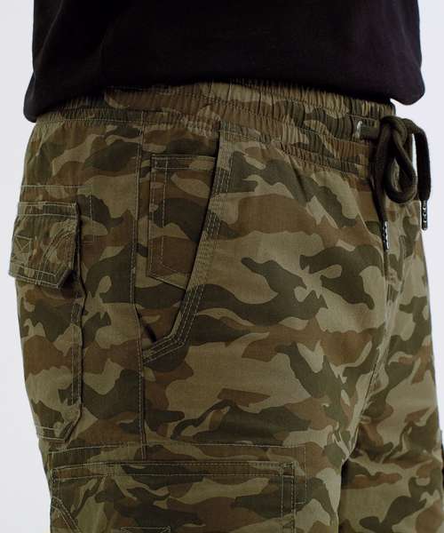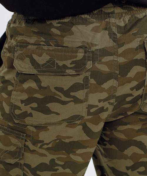 Two swings pockets with coin pocket and two back bellowed pockets with hook and loop fastening. Bellowed pockets to either leg with hook and loop fastening. Elasticated waistband with drawstrings. Gunmetal eyelets and drawstring ends. Fly stitched detailing. Soft finish fabric.